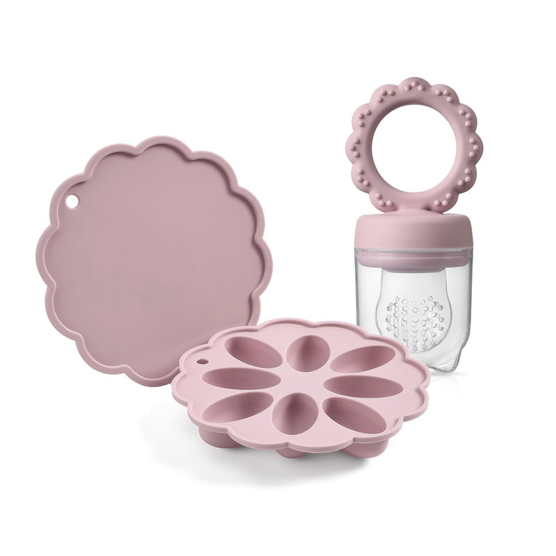 أساسيات الفطام 2 في 1: تجمع بين قالب سيليكون على شكل زهرة (للمصاصات الصغيرة) ووحدة تغذية شبكية (للأطعمة الطازجة/المجمدة)، مما يلغي الحاجة إلى أدوات تغذية متعددة للأطفال.